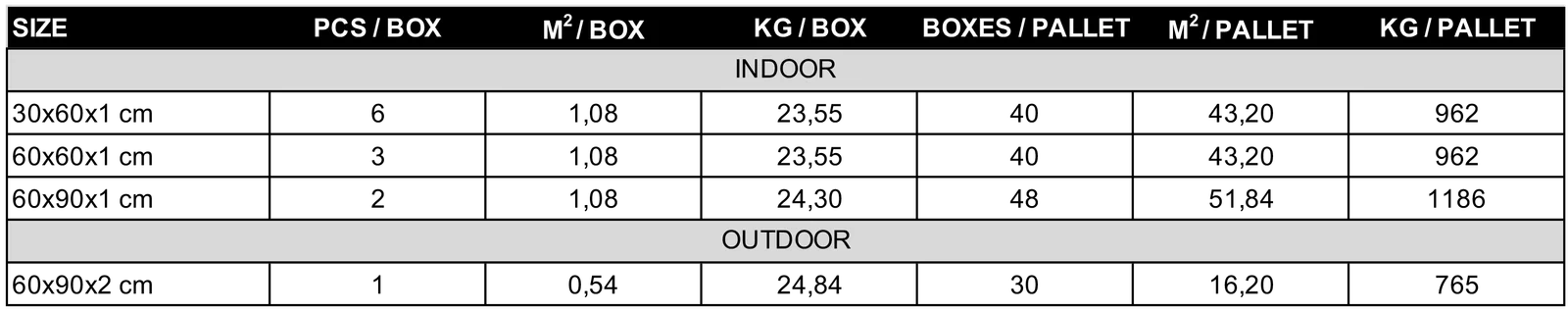 1 Karton enthält 1 Fliesen (0,54 m2 / 24,84 kg) | Boxen | ||||